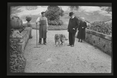 Valleko kondea, bere txakurra, emakume bat eta lorezaina lorategian | Perros del excmo Conde del Valle |