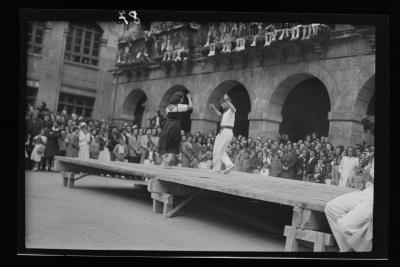 | Dantzari bikotea dantzan San Martin Agirre plazako taulatu gainean eta ikuslegoa begira | XXX Vergara 15-junio-1943 y cliches varios antiguos |