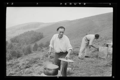 | Bi gizon, bat sua egiten eta bestea eltze batekin janaria prestatzen. Mendian daude. | 26-6-44 xxx |