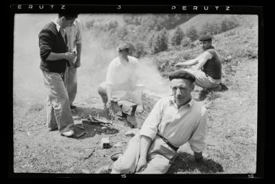 Gizonak lurrean eserita mendian, bat sua egiten. | 26-6-44 xxx |