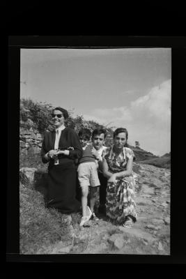 | Bi emakume eta gizon bat mutiko batekin, mendian eserita. |