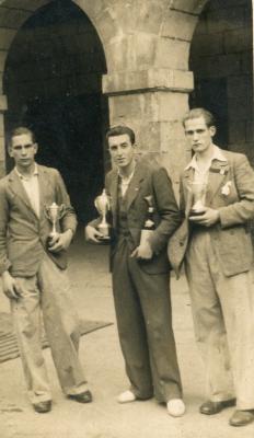 | Hiru gizonezko garaikurrekin Udaletxe aurrean | Pascuas de Pentecostes |