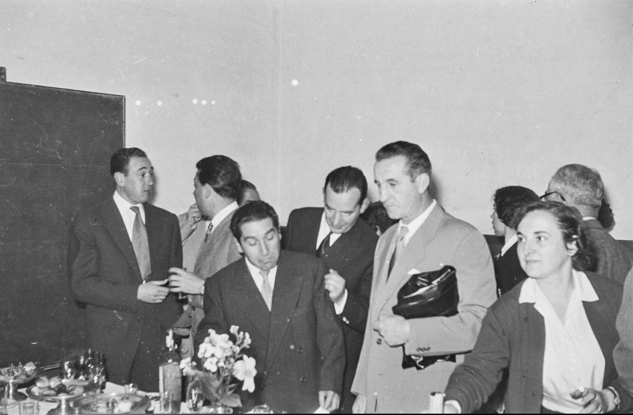 | Gizon talde bat eta emakume bat mahai ondoan |