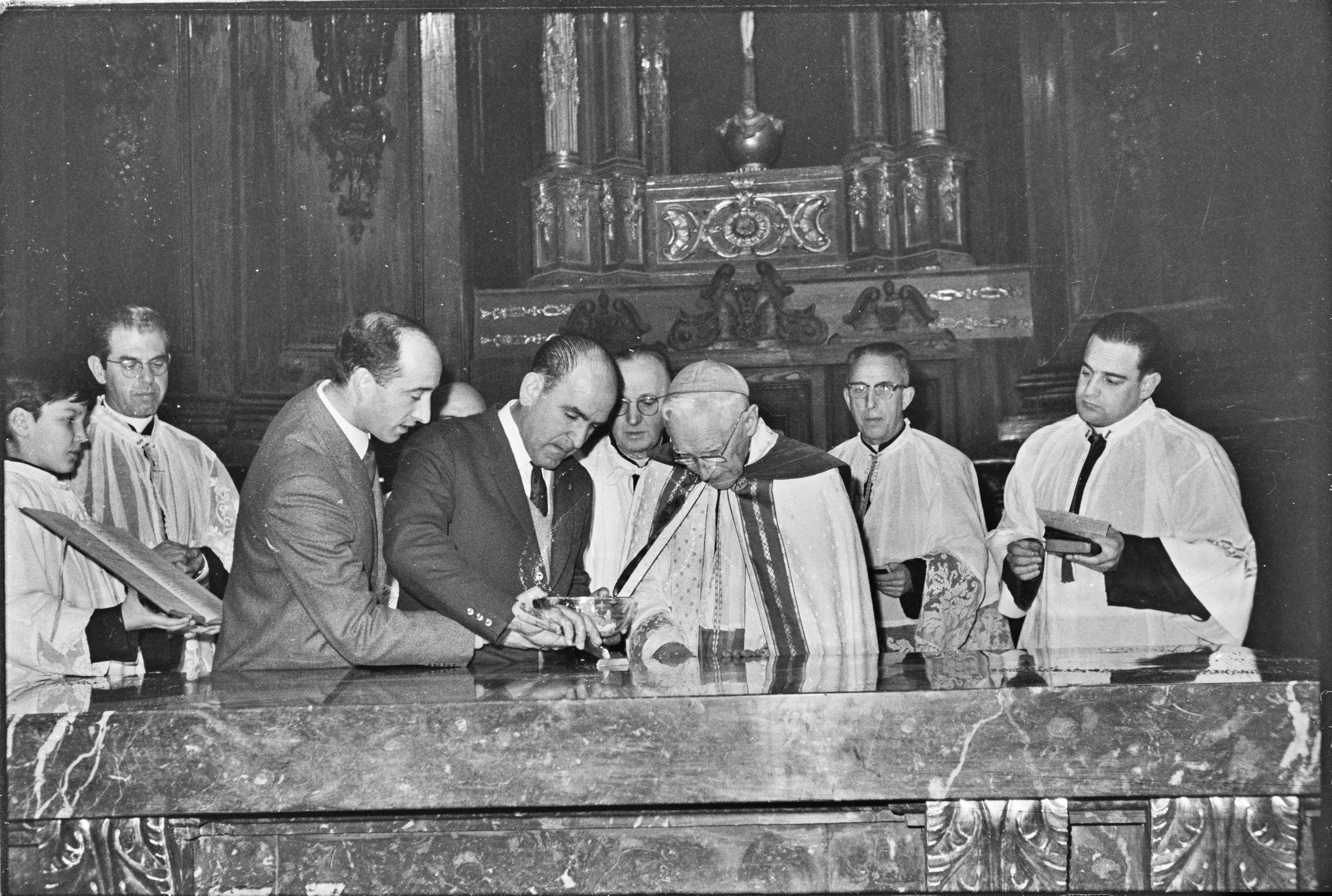 | Bi gizon eta apaiz talde bat aldarearen inguruan. | Obras altar Santa Marina - Bendición 4-febrero-1968 |