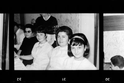 | Ezkontza bateko gonbidatuak mahian eserita. |