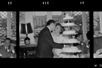 | Ezkonberriak tarta mozten, gizona emakumeari musu bat ematen. |