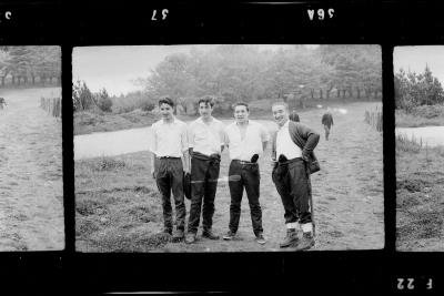 | Lau gizon, atzean Asentzioko putzua eta zuhaitzak dituztelarik. |