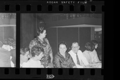| Jendea mahaian eserita eta emakume bat zutik. |