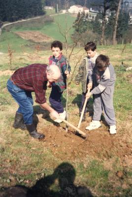 | Zuhaitz egunean, gizon bat eta hiru mutiko zuhaitz bat landatzen |