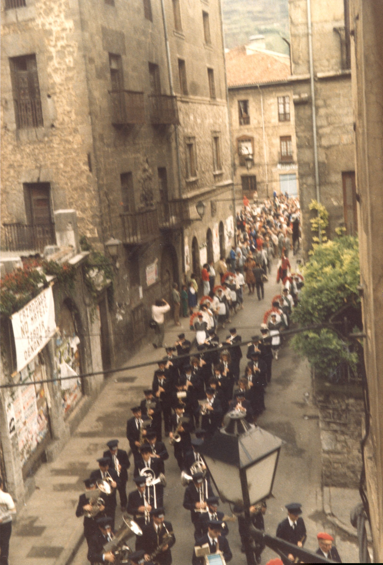 | Bergarako Udal Banda bidekurutzeta kalean. Atzetik jende multzoa |
