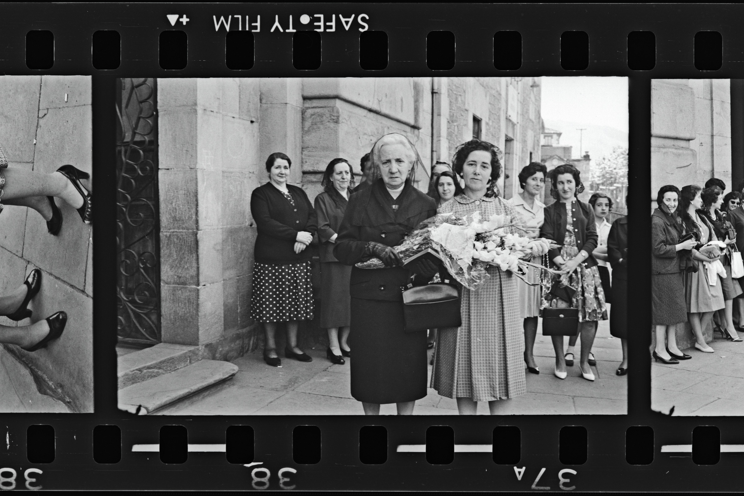 Otazua textil lantegiko 50. urteurreneko ospakizuna: Mariaren Lagundiko atrioan lore sorta ematea | Bodas de oro Textil Otazua Llegada Obispo 12-junio-1960 |