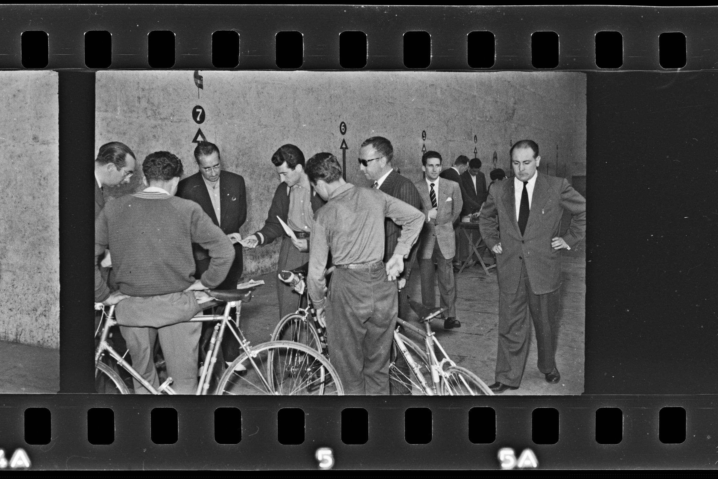 | Txirrindulariak frontoi barruko kontrolean | Campeonato de España fondo en carretera.- 5-8-956 |