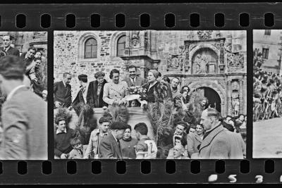| Lasterketarren helmugako tribuna jendez beteta; behean txirrindularia | Carrera ciclista.- Oñate.- 1947 |