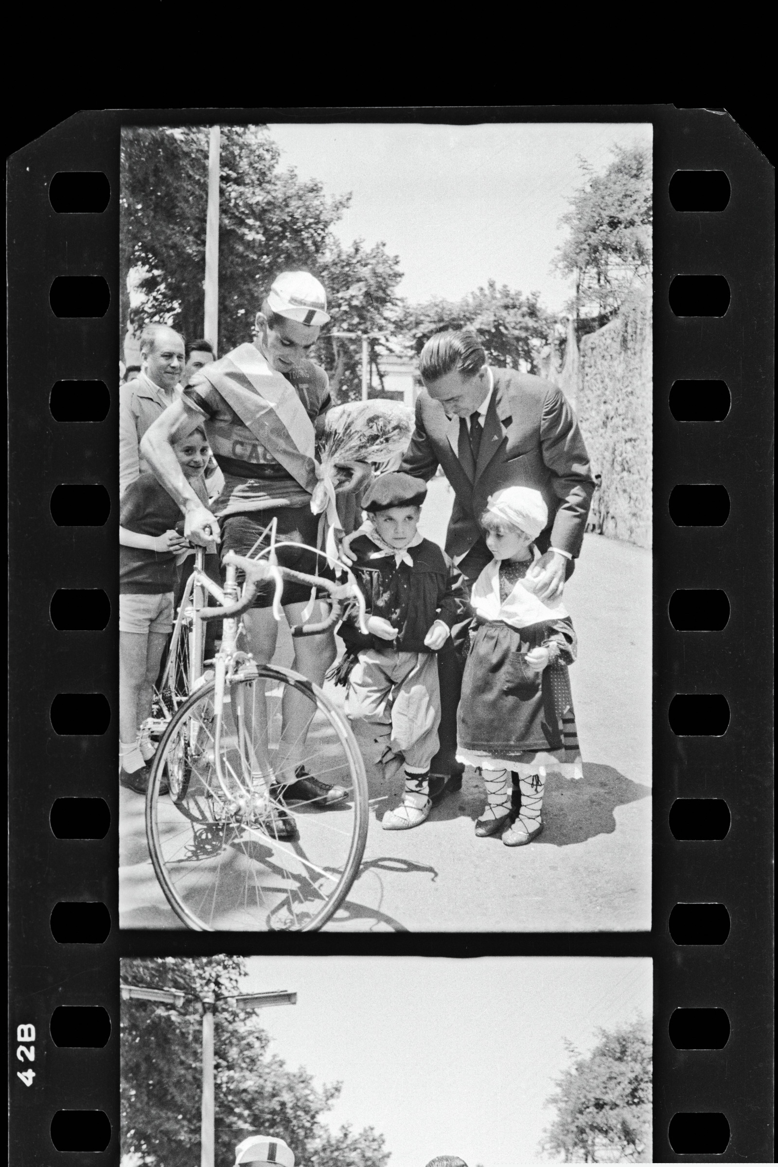 | Talde erretratua: Txirrindularia irabazlearen banda eta loresortarekin, kalez jantzitako gizona bere alboan eta neskamutikoak baserritar jantzita aurrean | En San Antonio. Ciclismo. Campeonato de Guipuzcoa de fondo en ruta. Aficionados. Vencedor: J. Aranzabal |