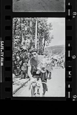 Txirrindularia ohorezko ibilbidea egiten loresorta eta koparekin | Ciclismo. Pascuas de Pentecostés. Vencedor: Carmelo Morales |
