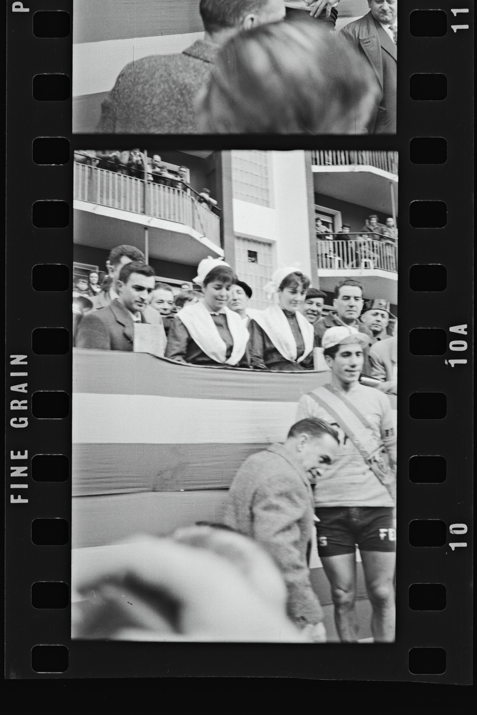 | Txirrindularia txapeldunaren bandarekin tribunaren ondoan | Campeonato de España de ciclo cross. Vencedor: Talamillo |