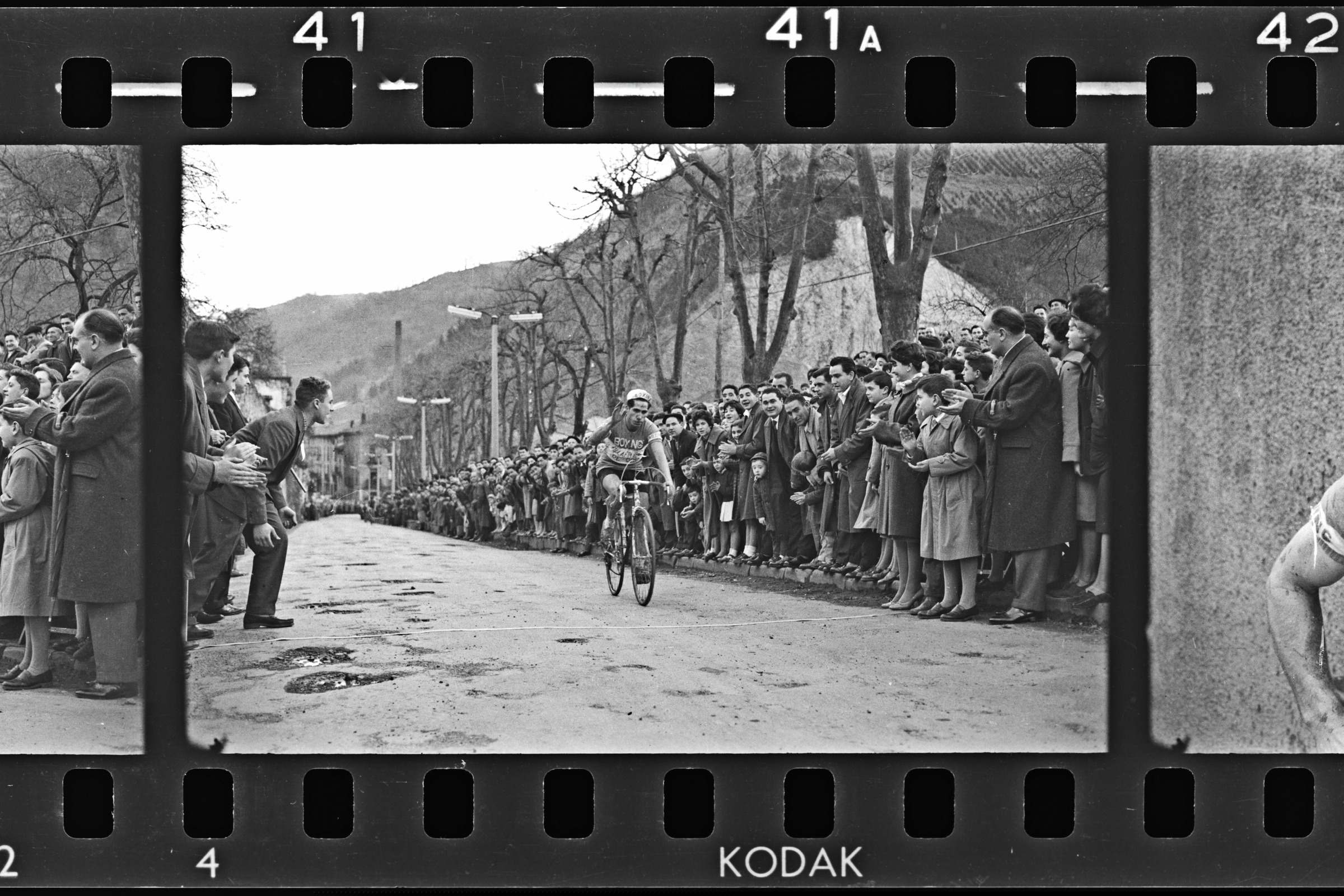 | Txirrindularia lasterketan, Espoloiko aldapa gora, helmugara heltzen. Bide basterrean ikuslegoa txaloka | Ciclo Cross Otsein. Vencedor: A. Barrutia |