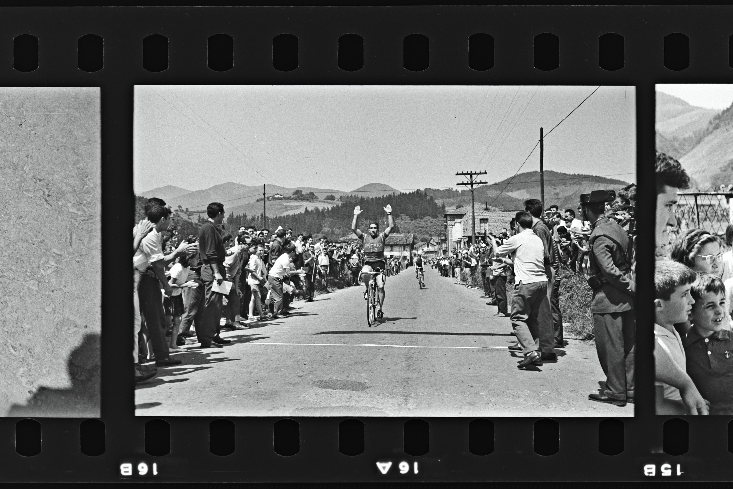 | Ginebra 3-3 taldeko txirrindularia helmugara sartzen besoak altzatuta | Ciclismo. San Lorenzo. Vencedor. Mendijur |