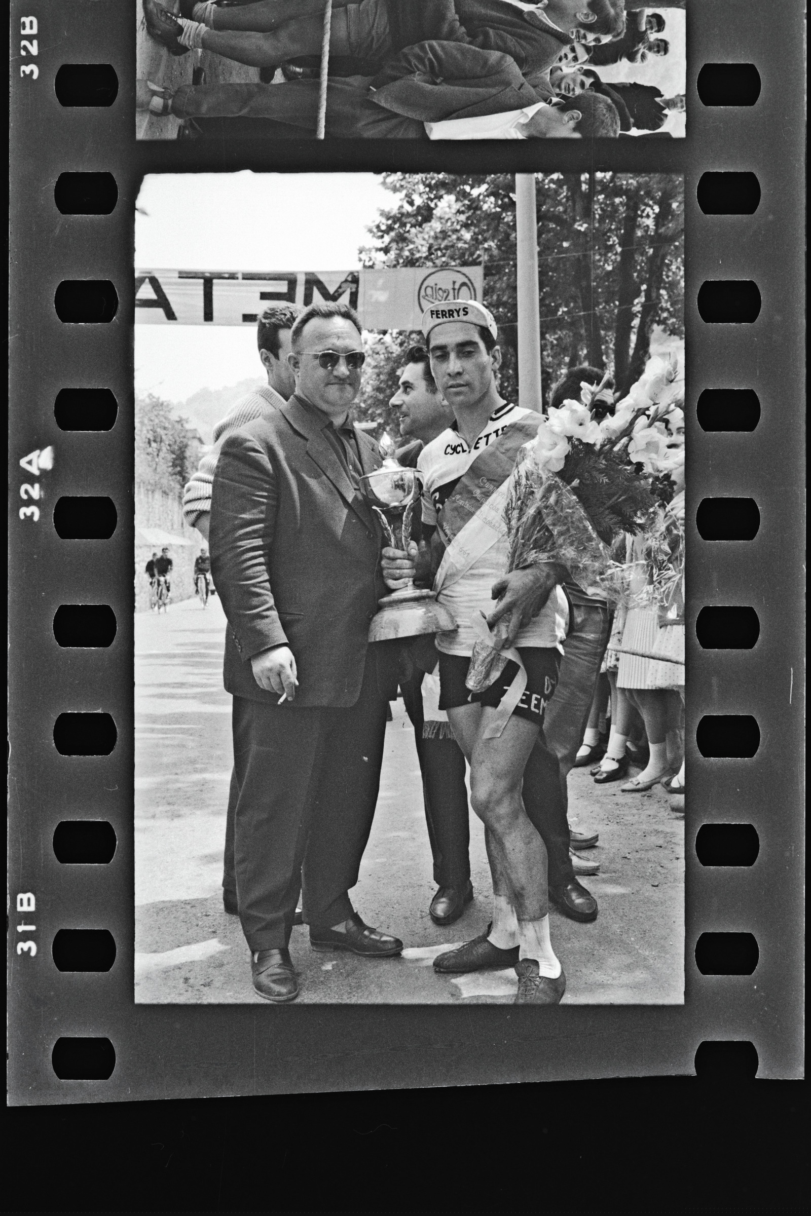 | Bi gizonen erretratua, bat txirrindularia loresorta eta koparekin, atzealdean "meta", helmugaren pankarta, ikusten da | Ciclismo. Campeonato de Guipúzcoa de montaña. Aficionados. Vencedor: Marotias |