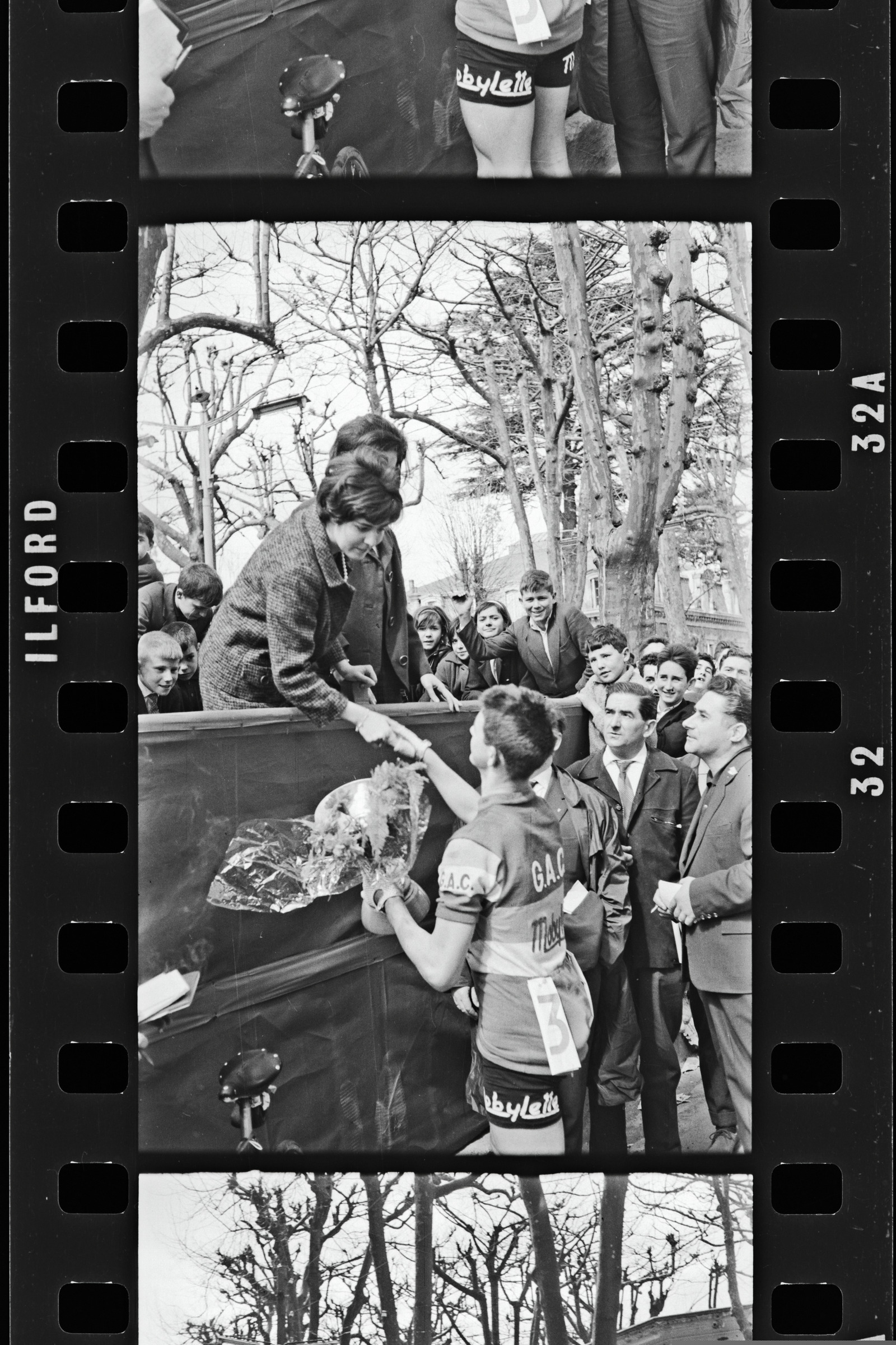 | G.A.C. Mobylette taldeko txirrindularia loresorta jasotzen | Ciclismo. III Criterium ciclista Algodonera de San Antonio. Vencedor: Perurena |