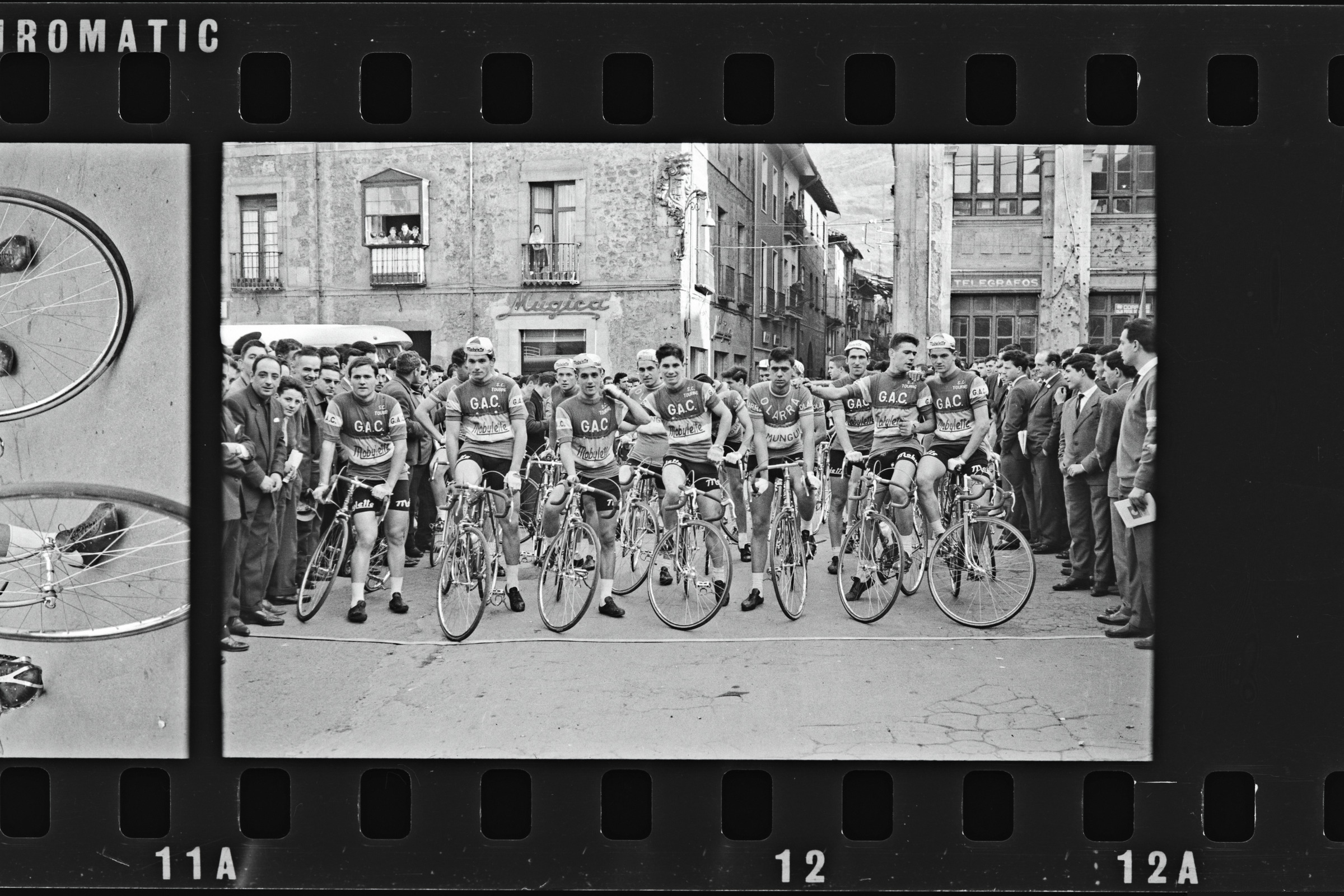 | Txirrindulariak lasterketaren irteeraren zain San Martin plazan; lehenengo lerroan G.A. Mobylette taldeko txirrindulariak | Ciclismo. III Criterium ciclista Algodonera de San Antonio. Vencedor: Perurena |