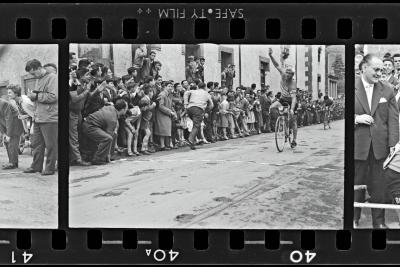 Txirrindularia helmugara heltzen besoa altzatuta; bide bazterrean jendea txaloka | Ciclismo. Pascuas de Pentecostés. Vencedor: |