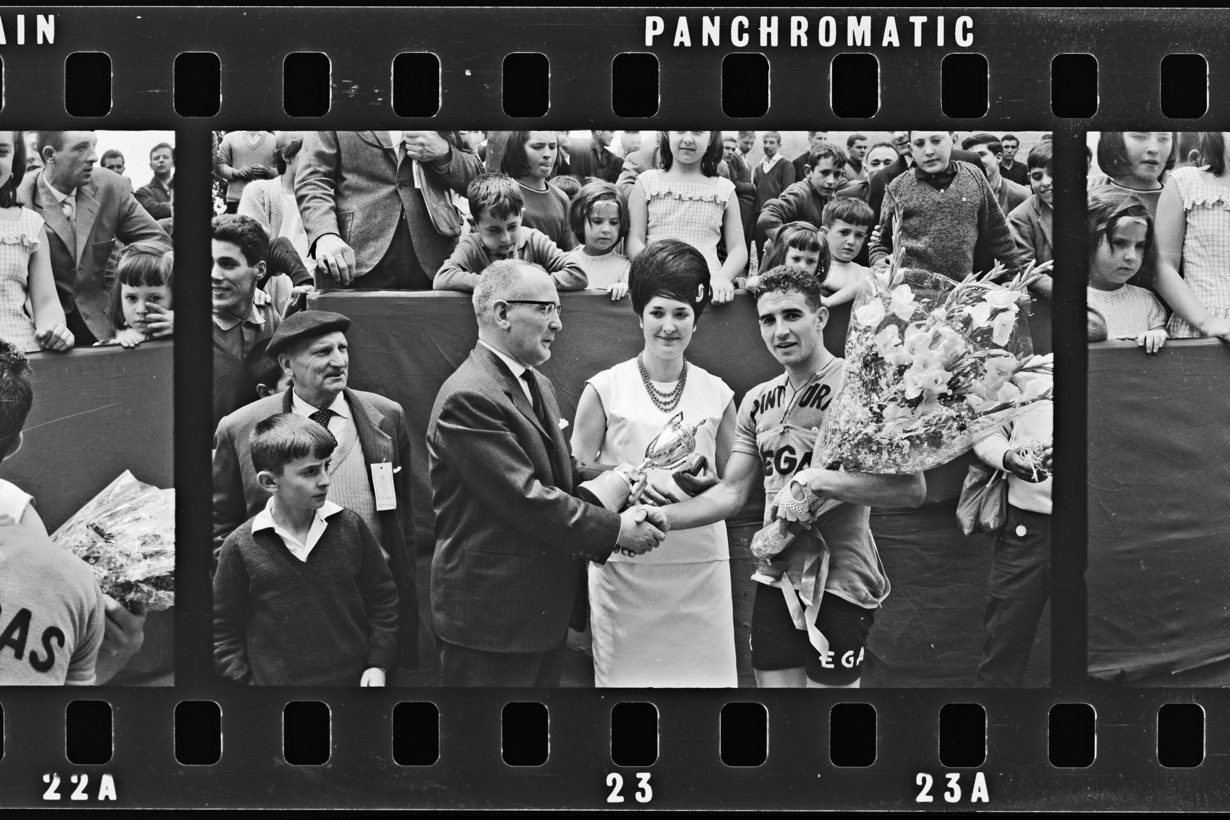| Txirrindulari lasterketaren sari ematea: Ega taldeko txirrindularia alkatearen eskutik kopa jasotzen, loresorta eskutan duela | Ciclismo San Antonio. Vencedor: Blanco |
