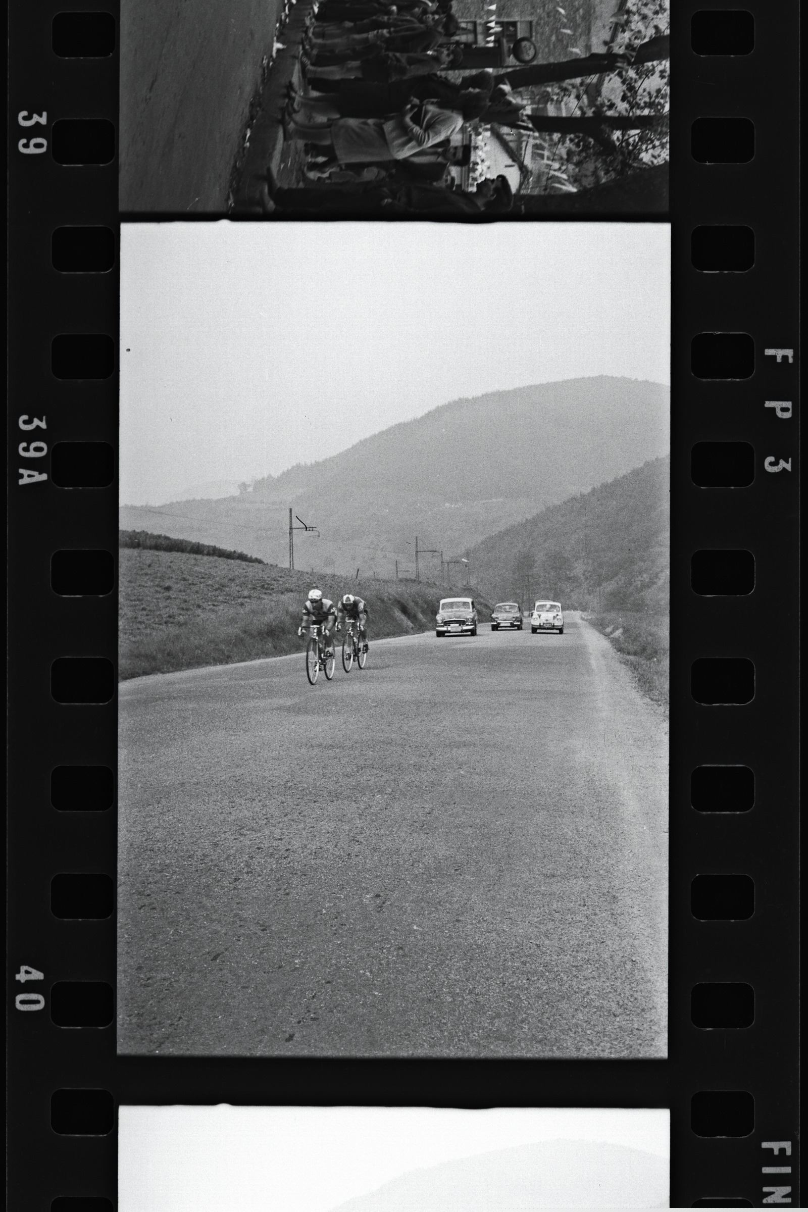 | Bi txirrindulari lasterketan; euren atzetik hiru kotxe | Ciclismo San Antonio. Vencedor: Blanco |