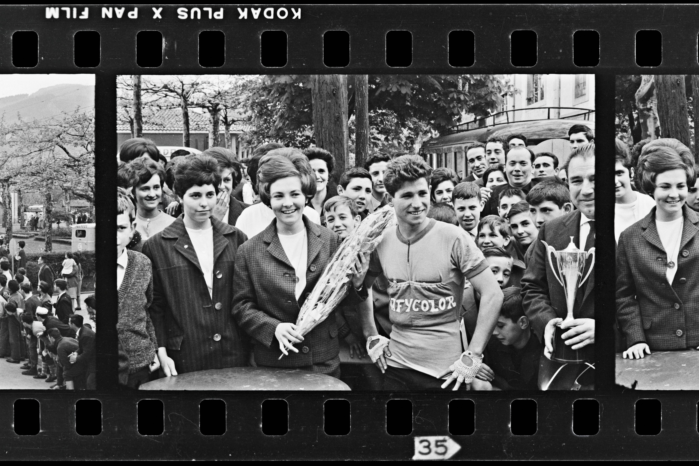 | Grafycolor taldeko txirrindularia loresorta eta kopa jasotzen. Ezkerrean bi neska, batek loresorta dauka, eta eskuman gizona koparekin. Atze aldean ikuslegoa | Ciclismo Altos Hornos. Vencedor: |
