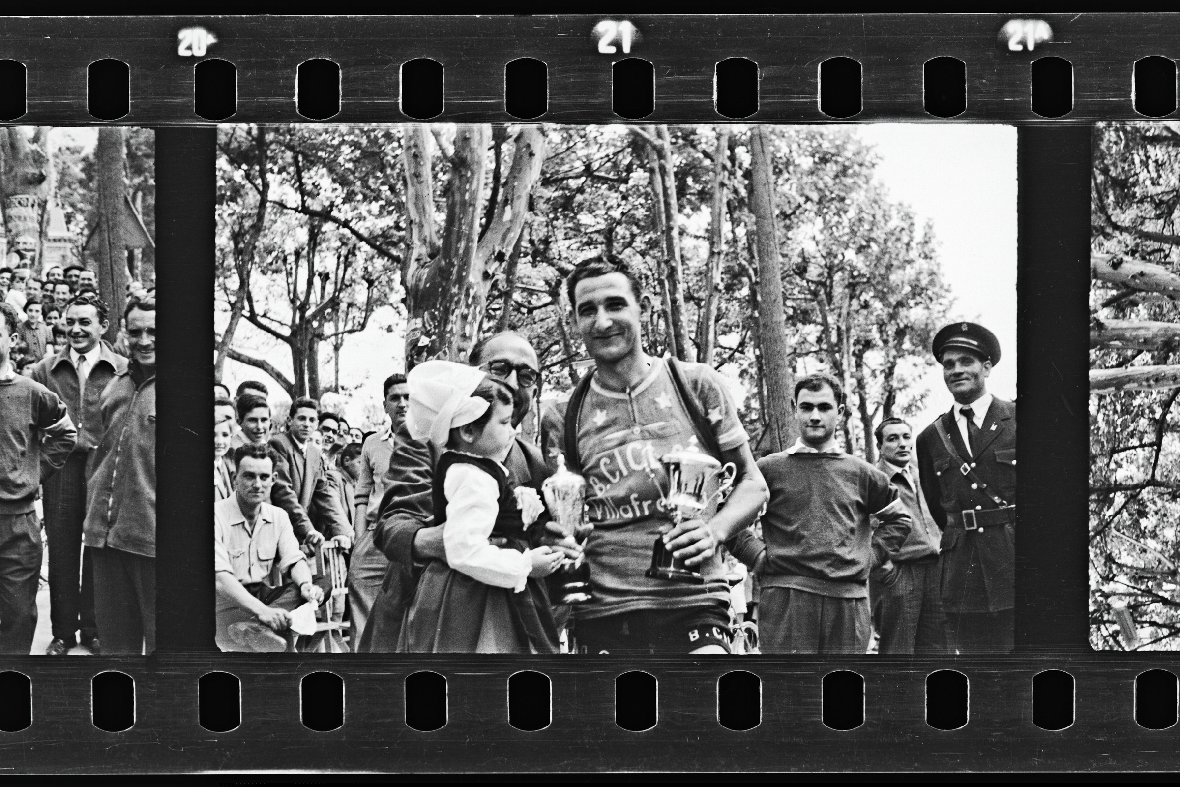 | Txirrindularia loresorta eta koparekin. beste kopa bat jasotzen neskatila baten eskutik. Eskuman bi gionz, bat udaltzaina. Barrenean ikuslegoa | Ciclismo Pascuas de Pentecostés. Vencedor: Aspuru |