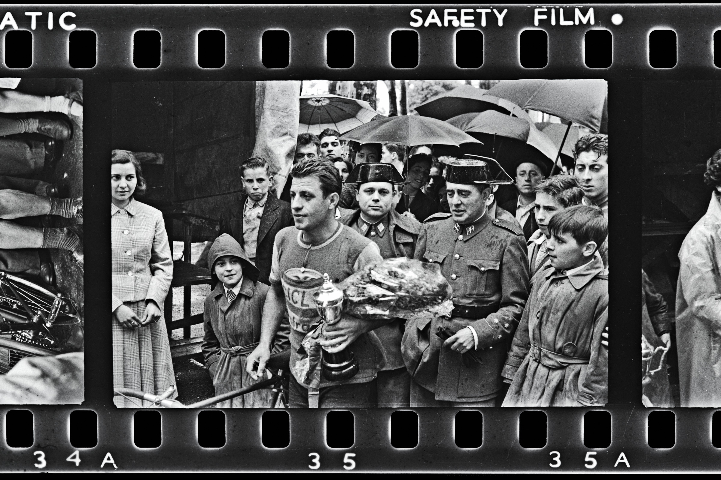 | Txirrindularia loresorta eta koparekin, atzean bi goardia zibil dauzkala, jende artean | Ciclismo Pascuas de Pentecostés. Vencedor: |