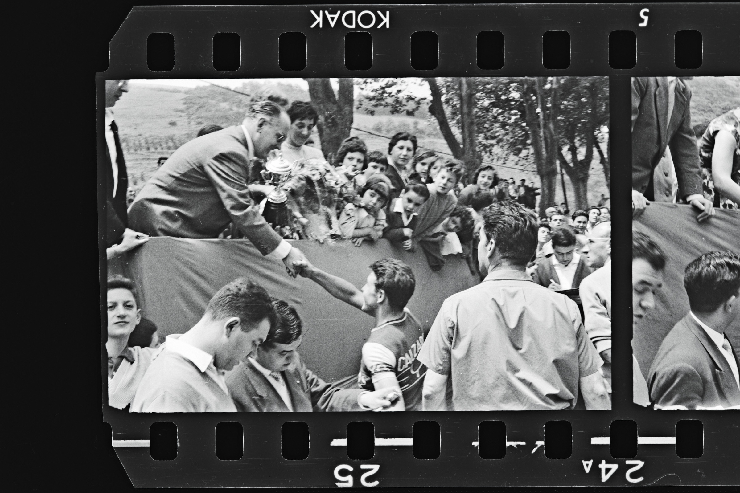 | Eya taldeko txirrindularia tribunan dagoen alkatearengandik kopa jasotzen | Ciclismo San Antonio. Vencedor: |