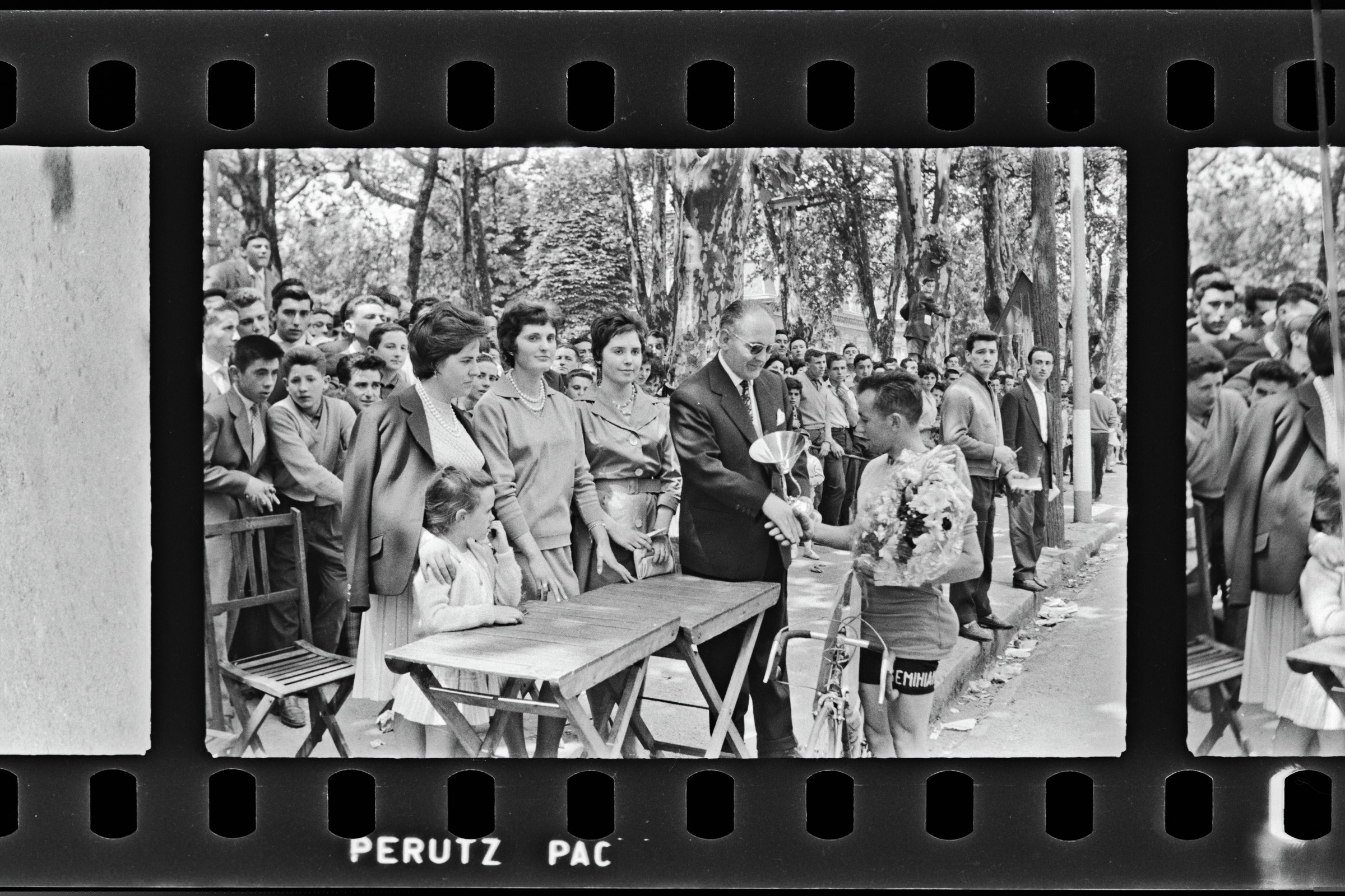 | Caobania taldeko txirrindularia loresortarekin alkatearen eskutik kopa jasotzen | Ciclismo Pascuas de Pentecostés. Vencedor: |