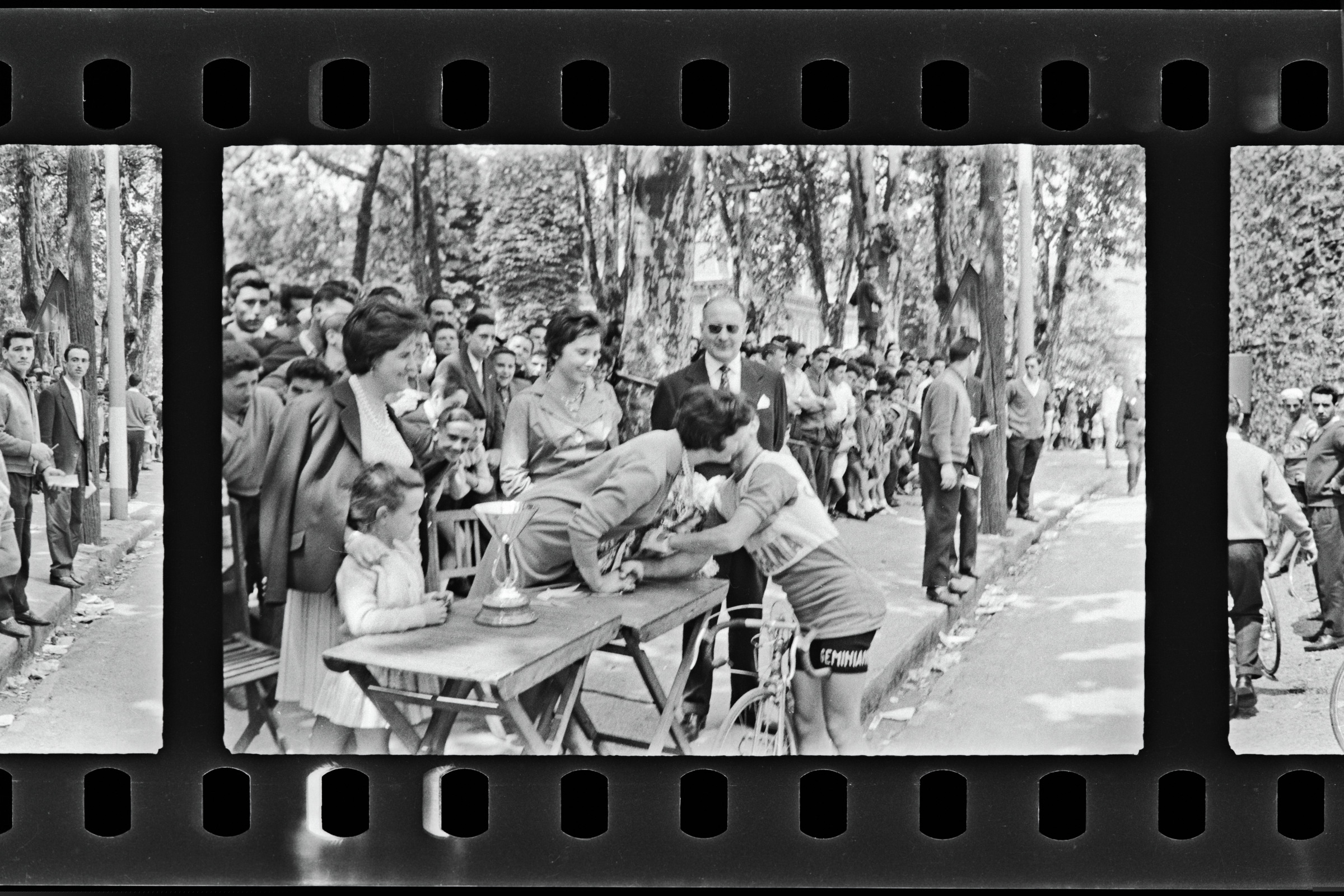 | Caobania taldeko txirrindularia loresorta eta neskaren besarkada jasotzen | Ciclismo Pascuas de Pentecostés. Vencedor: |