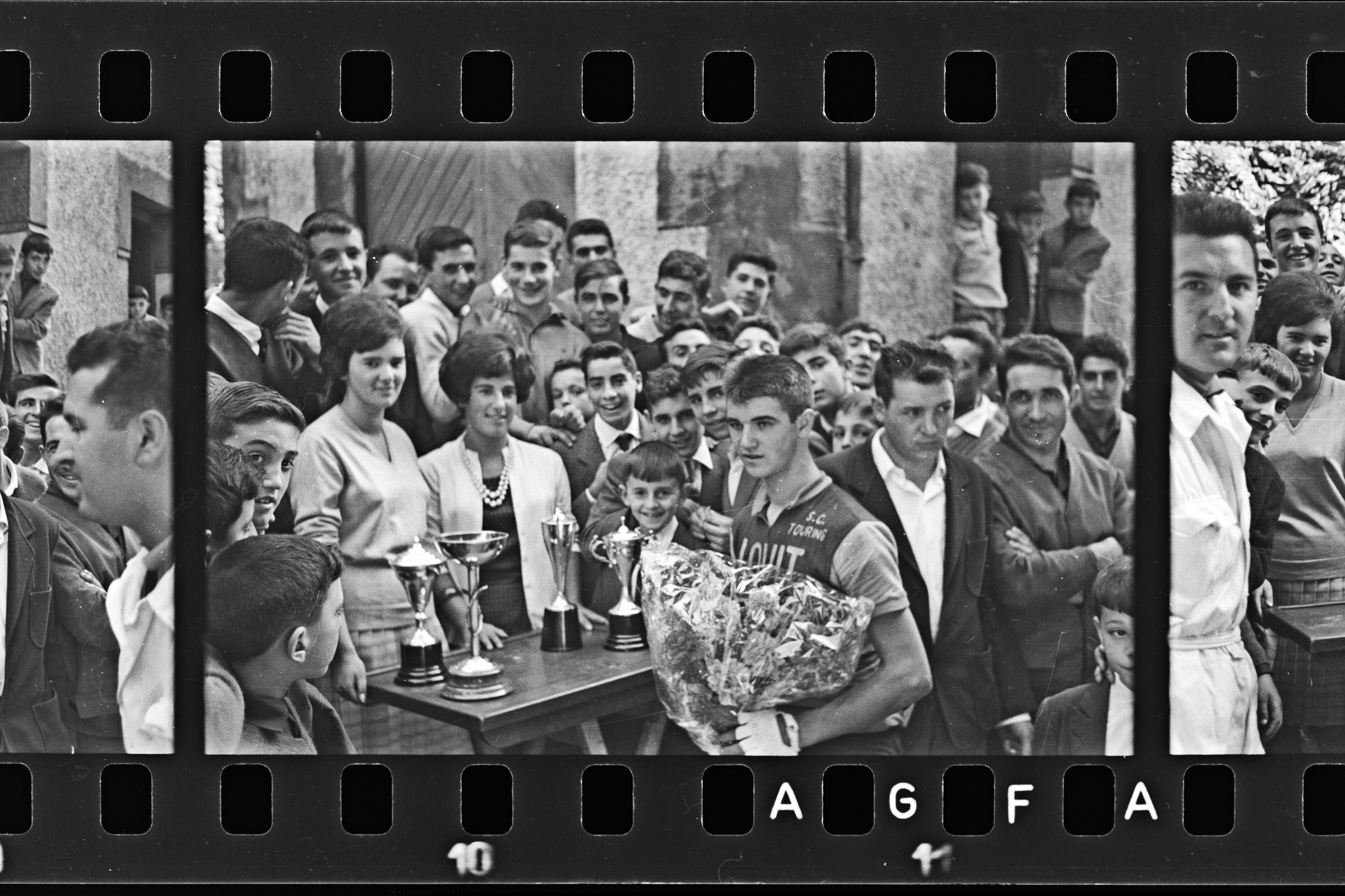 | Txirrindularia, loresorta eskuan, sarien mahaiaren ondoan | Ciclismo Segundo premio San Martin. Vencedor: |