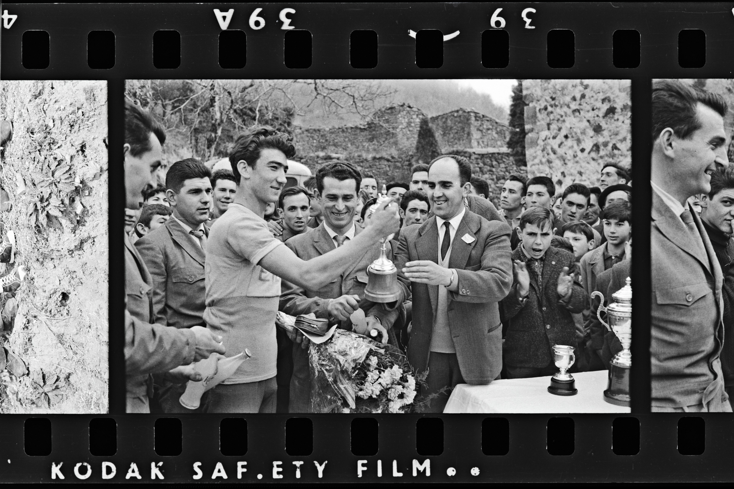 | Antzuolako alkatea kopa entregatzen irabazleari, jendez inguratuta | Ciclismo. Anzuola. Segunda subida a Uzarraga. Vencedor: Malvar |