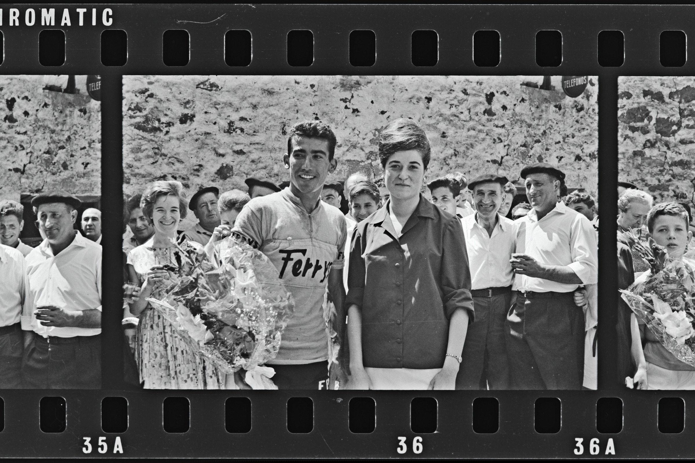 | Ferrys taldeko txirrindularia loresortarekin, neska batekin, jendez inguratuta | Ciclismo. Anzuola. Tercera subida a Uzarraga. Vencedor: F. Marti |