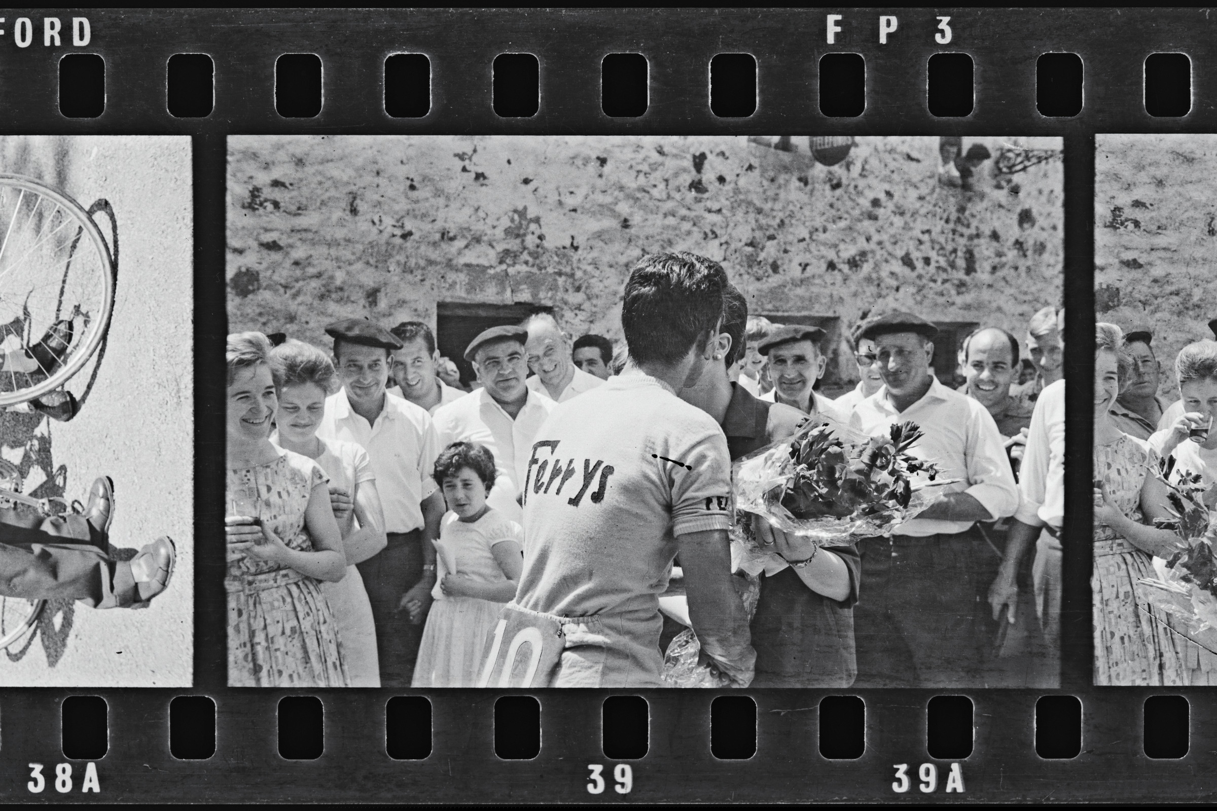 | Ferrys taldeko txirrindularia loresorta jasotzen eta neska besarkatzen | Ciclismo. Anzuola. Subida a Uzarraga. Vencedor: |