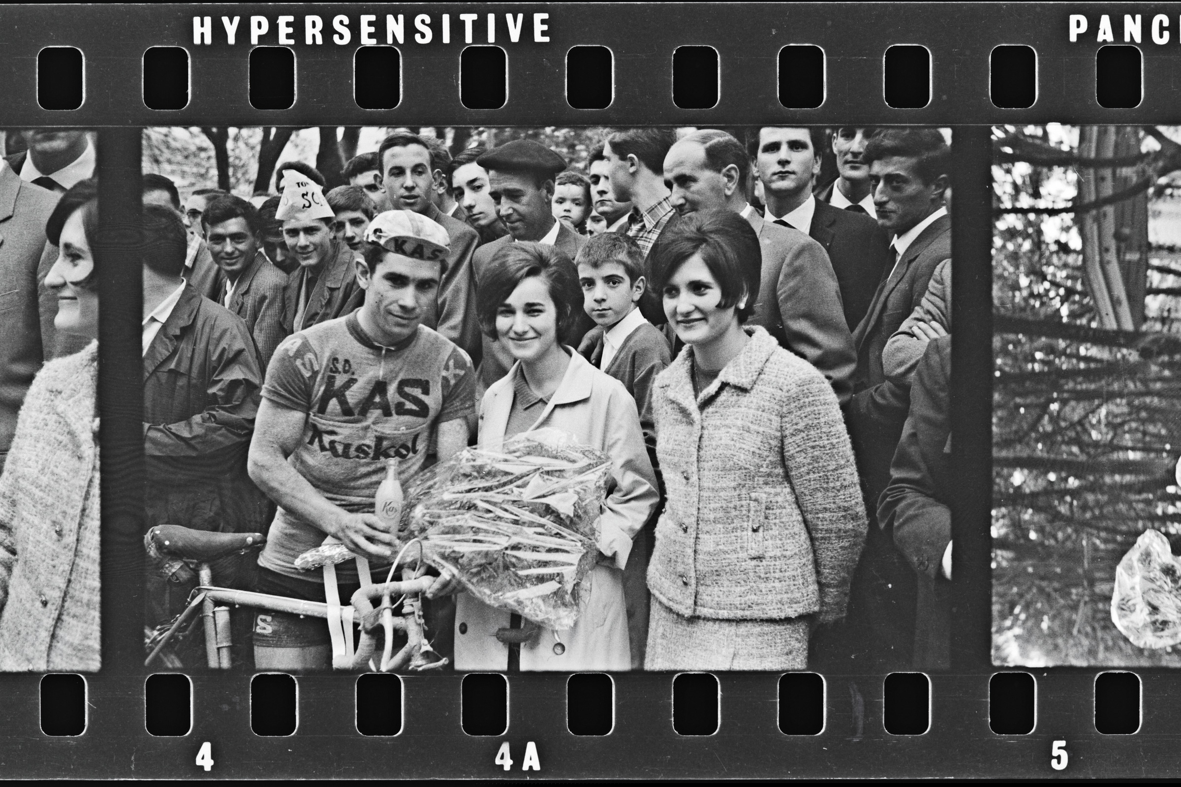 | Kas taldeko txirrindularia loresortarekin eta bi neskekin; atzean ikuslegoa | Ciclismo. Pascuas de Pentecostés. Vencedor: |