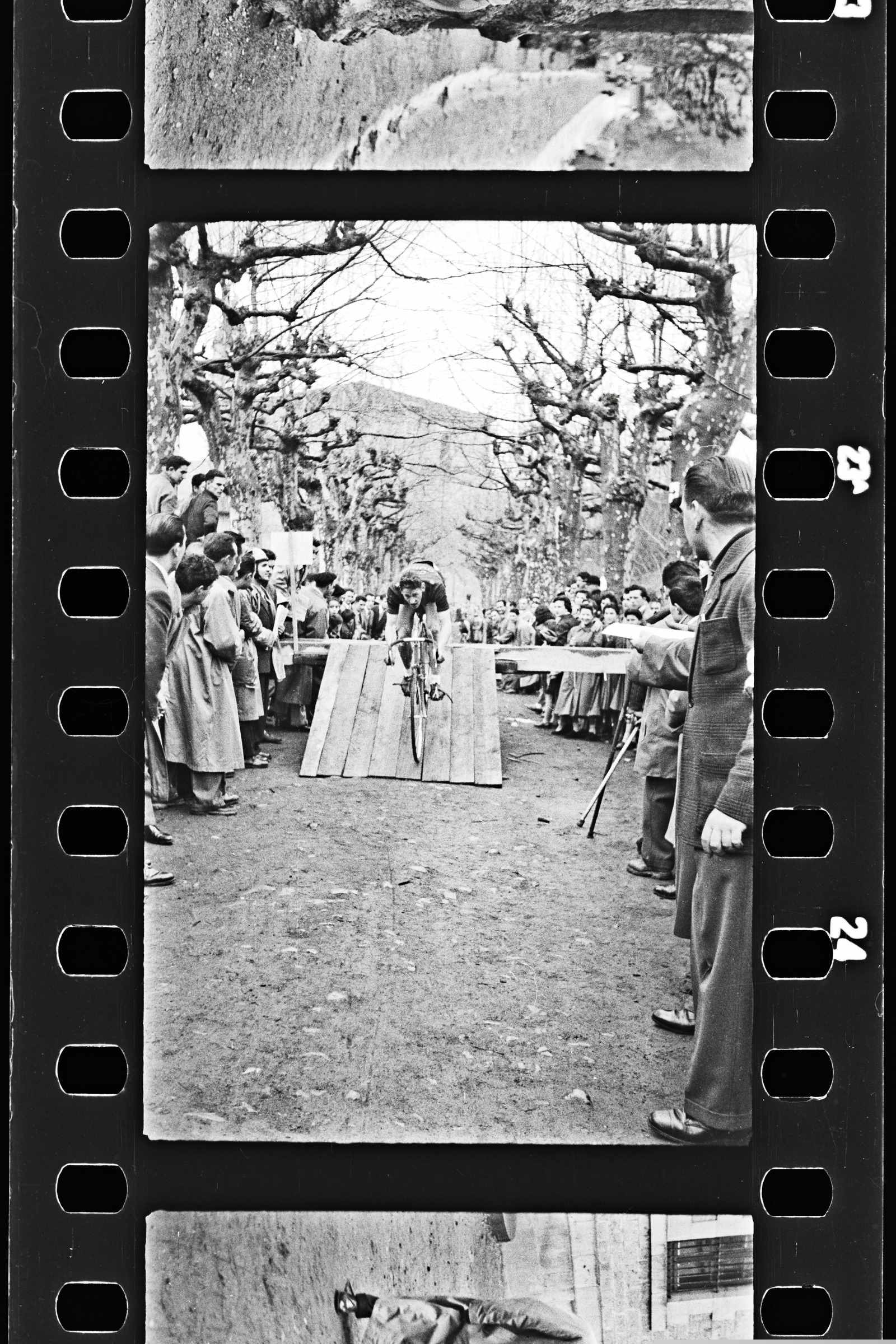 | Espainiako Ziklo-Kros txapelketa: txirrindularia taula baten gainetik pasatzen Irizar pasealekuan | Ciclo cross. Campeonato de España. Vencedor: Michelena |