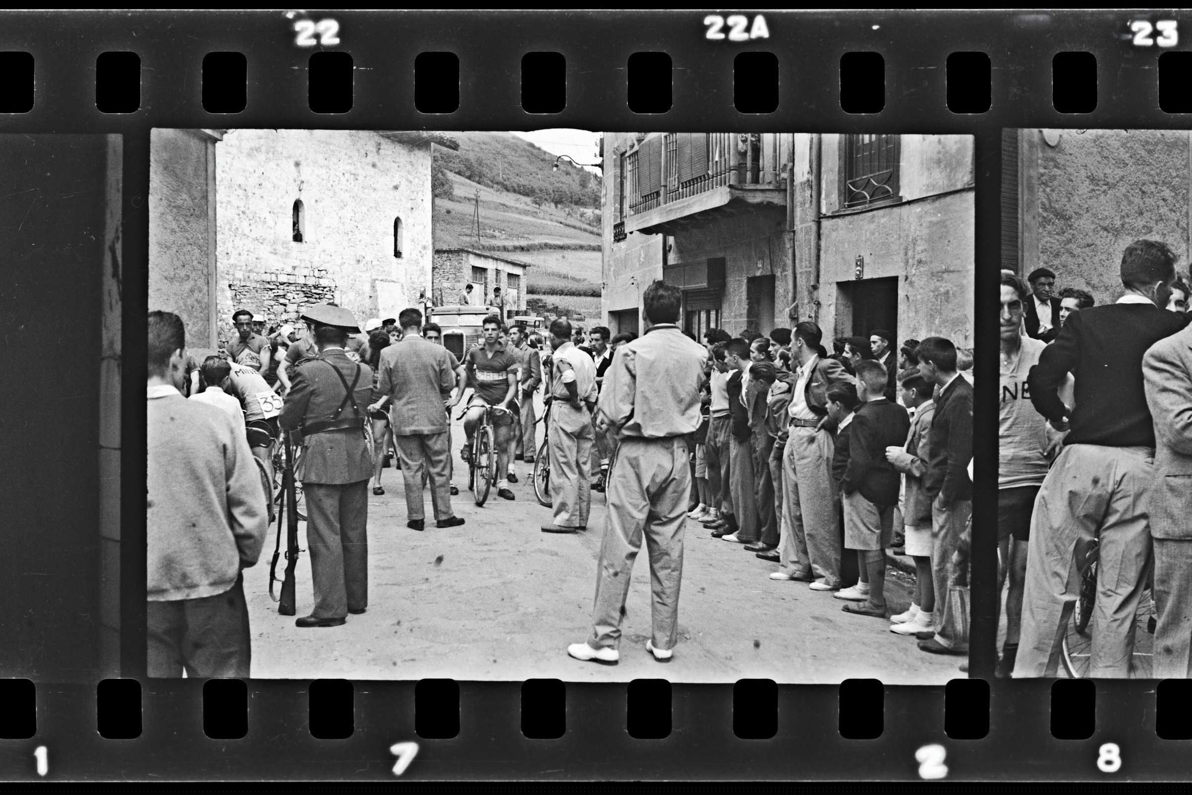 Txirrindulari lasterketaren irteera San Antonion; lehenengo planoan antolatzaileak eta goardia zibila; barrenean Karloskua ikus daiteke | Ciclismo San Antonio. |