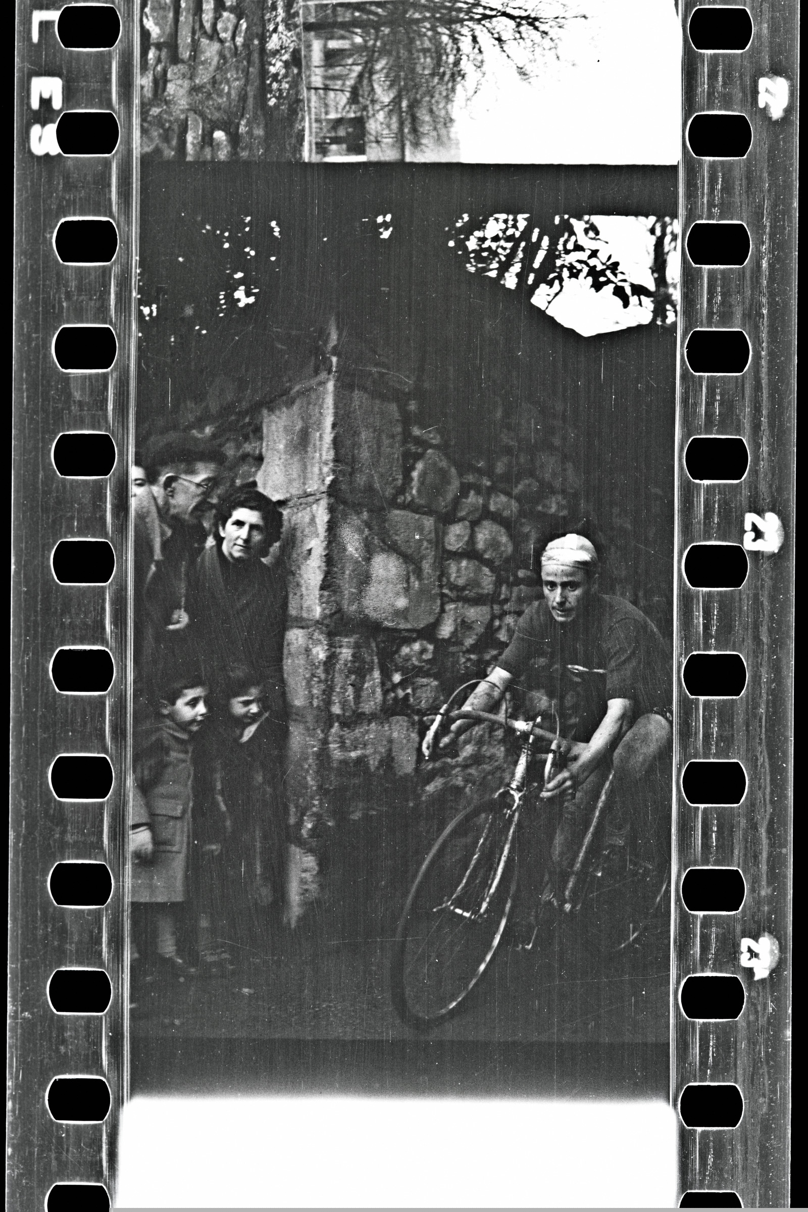 | Txirrindularia ziklo-kros lasterketan, paretaren ondotik pasatzen. Ezkerrean gizona, emakumea eta neskamutikoak | Ciclismo San Antonio. Vencedor: Antonio Barrutia |