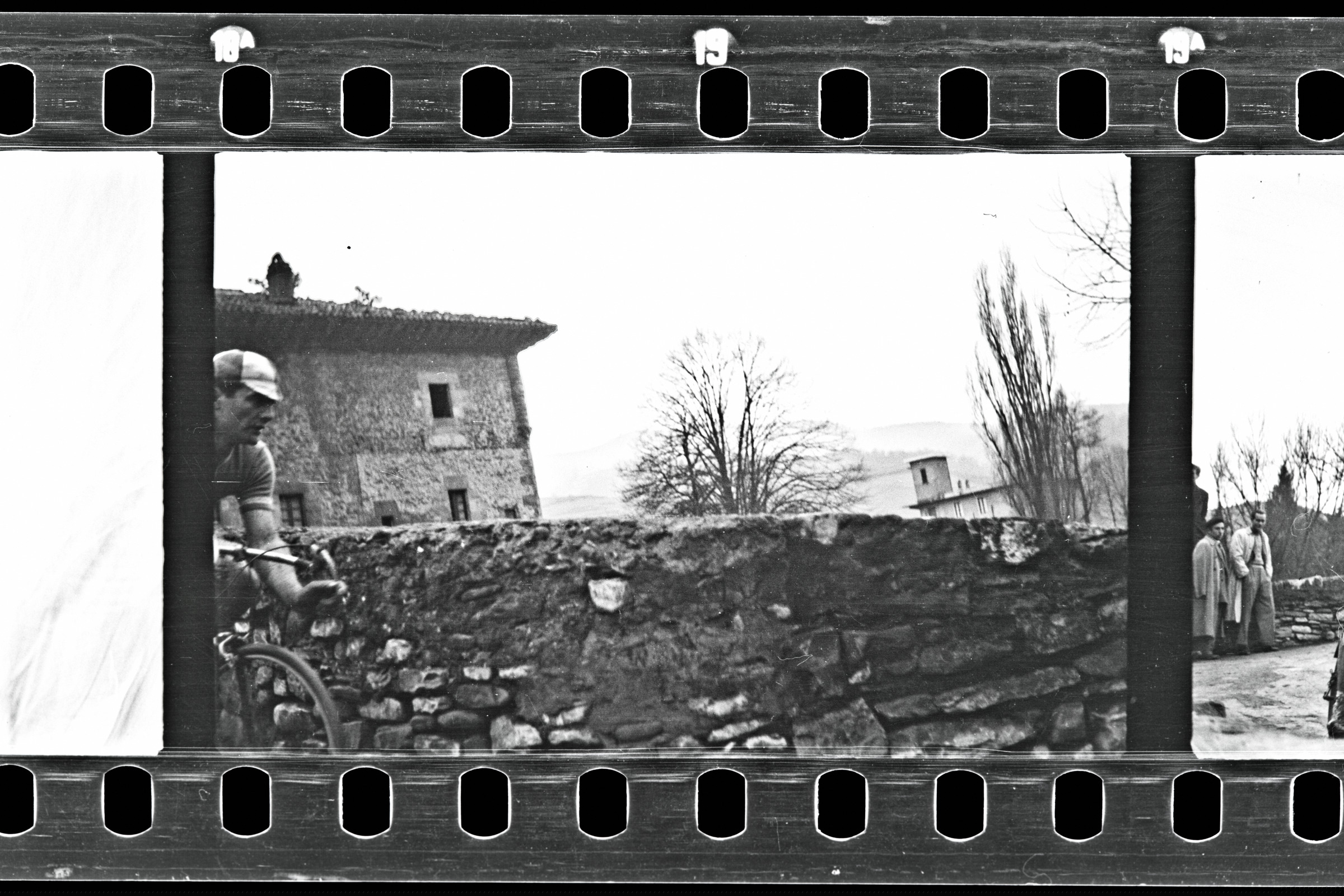 | Txirrindularia ziklo-kros lasterketan, Zubietako zubitik pasatzen. Bigarren planoan Laureaga torre. | Ciclismo San Antonio. Vencedor: Antonio Barrutia |