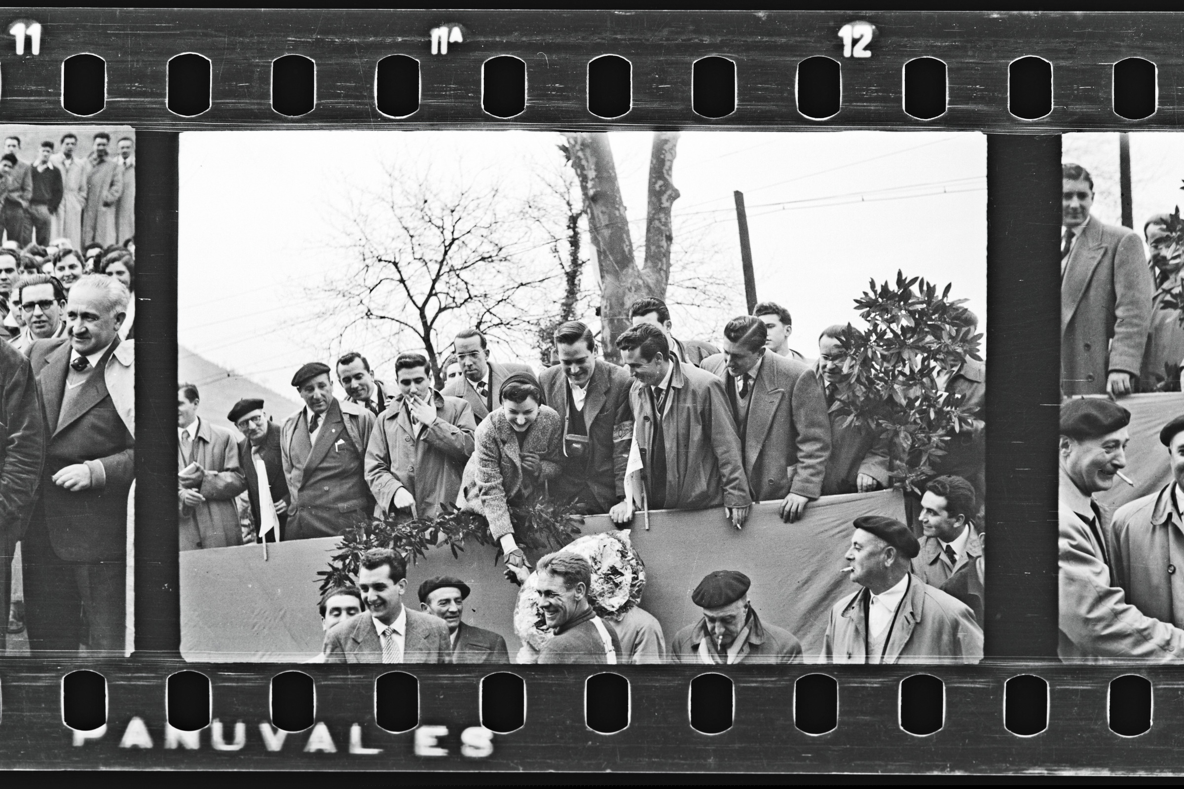 | Gamma taldeko txirrindularia Espoloiko helmugan irabazlearen loresorta jasotzen | Ciclismo San Antonio. Vencedor: Antonio Barrutia |