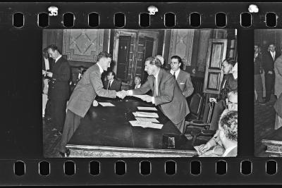 | Udaletxeko pleno aretoan, Madurako etxe berrietako giltzak emateko ekitaldia | 30-IX- 956 Bendición y entrega títulos casas San Lorenzo |
