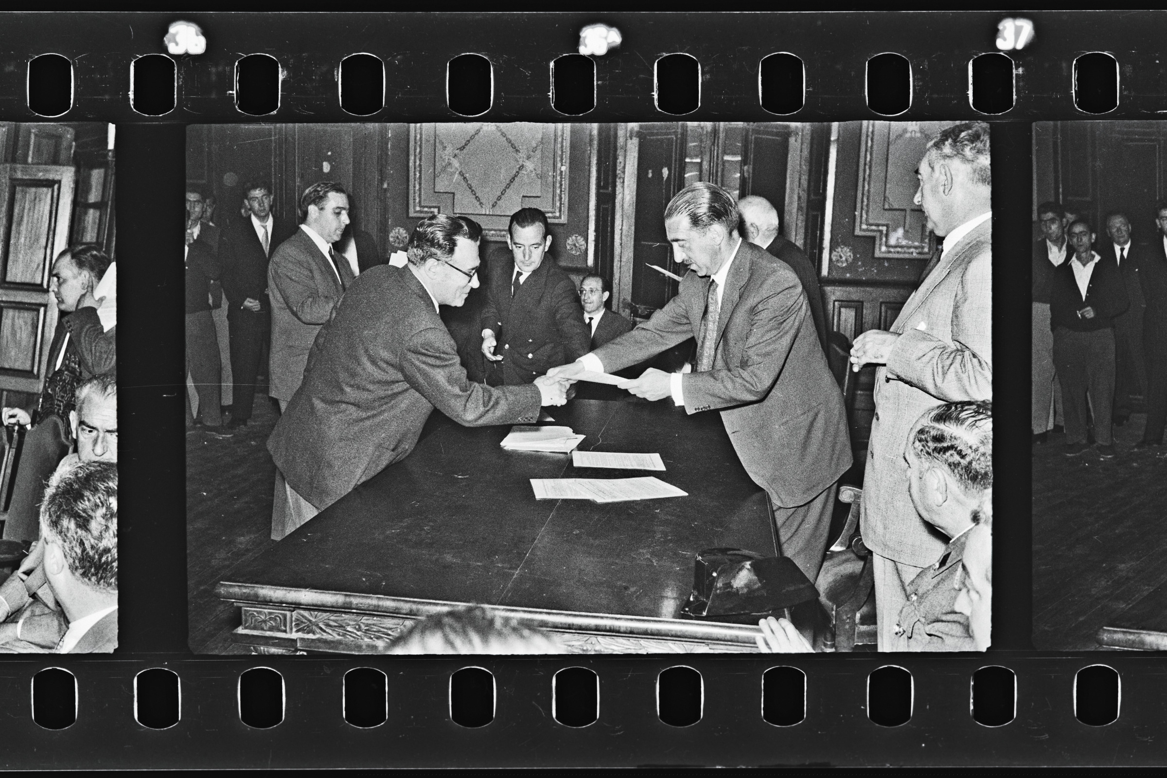 | Udaletxeko pleno aretoan, Madurako etxe berrietako giltzak emateko ekitaldia | 30-IX- 956 Bendición y entrega títulos casas San Lorenzo |