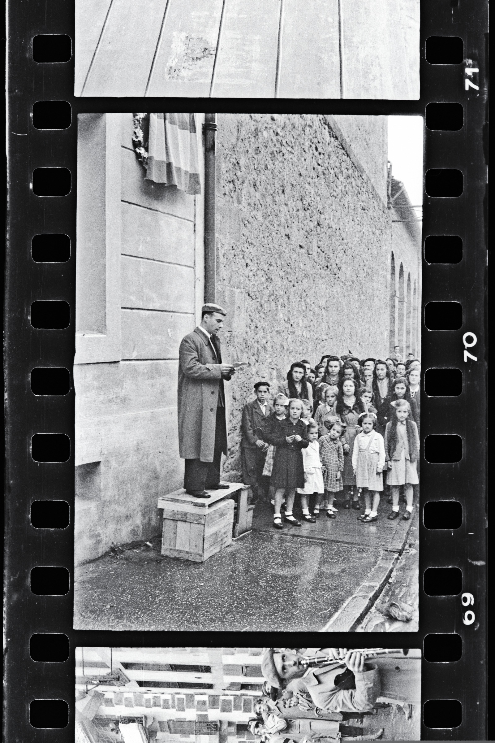 | Antzuolako Bustinzuri kaleko plakaren azpian gizon bat zutik eta beste guztiak bere begira. Agustin Telleria kalearen plaka jarri zenekoa izan daiteke | Brazo levantado |