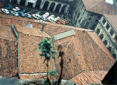 San Pedro kaleko 2,4 zenbakiko etxeen eta Udaletxearen teilatuak . San Pedro elizako kanpandorretik ikusita; argazkiaren goikaldean Seminarioko arkupea, San Martin Agirre plazako aparkalekua, Izagirre etxea eta azokako eraikuntza ikus daitezke. |