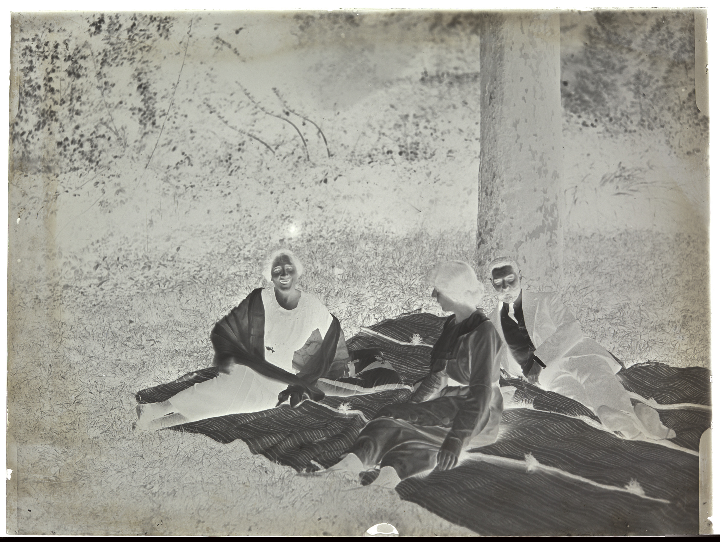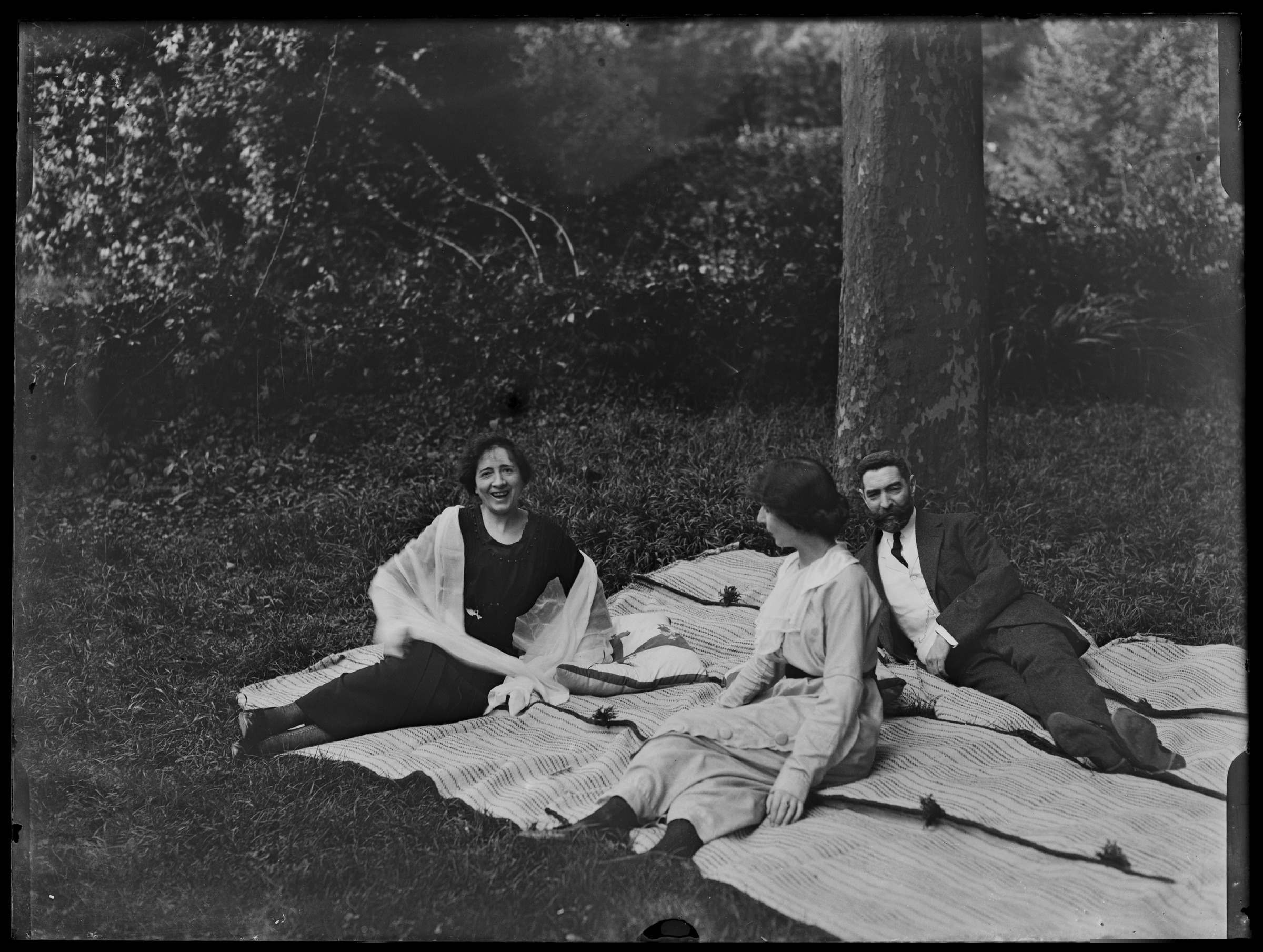 | Bi emakume eta gizon bat zelaian eserita, Errotalde jauregian |