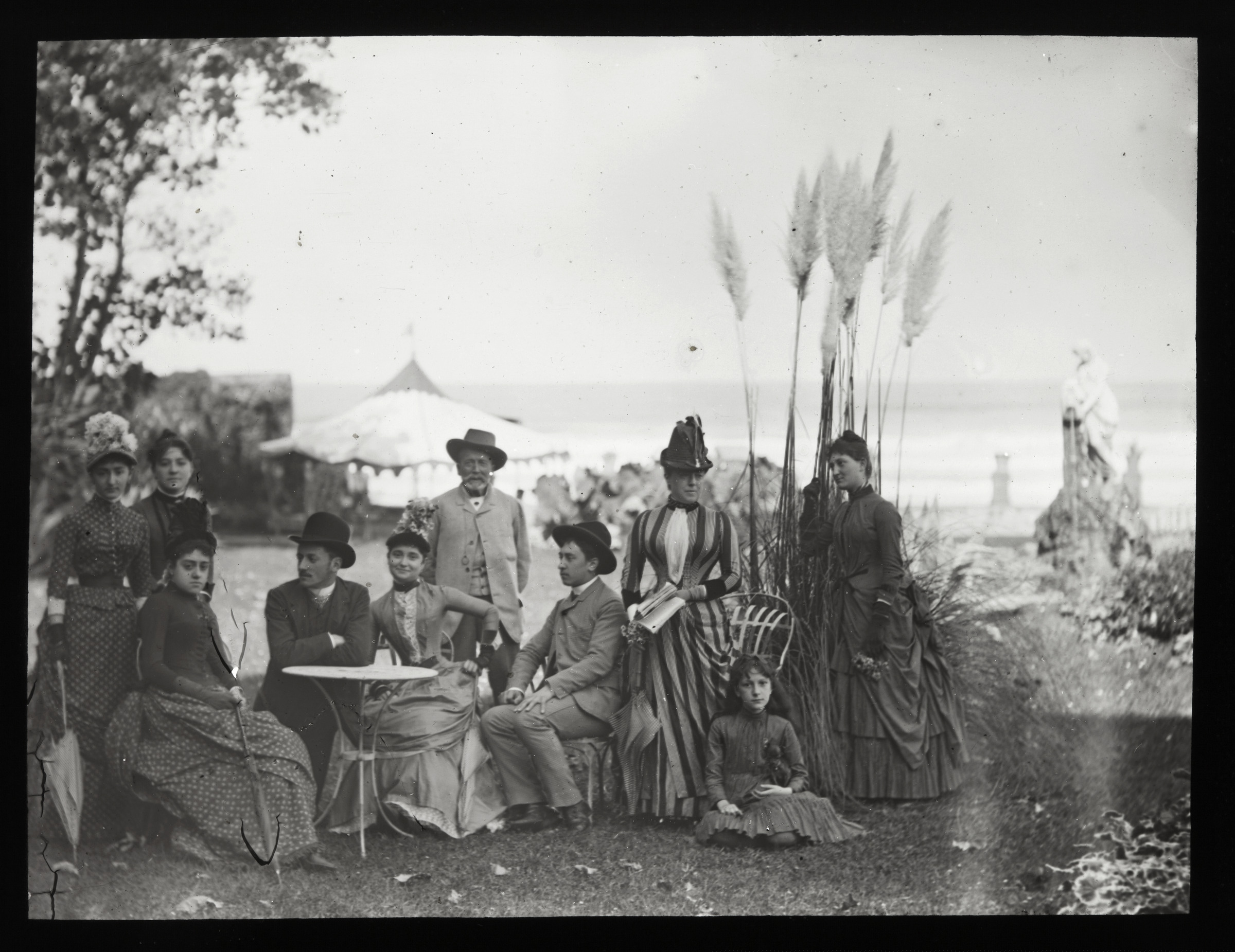 Talde baten argazkia, lorategi batean eserita eta kostatik gertu | Elgé. [imp.r]. |